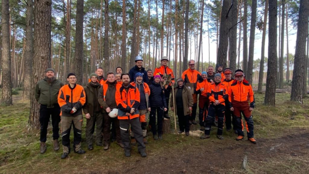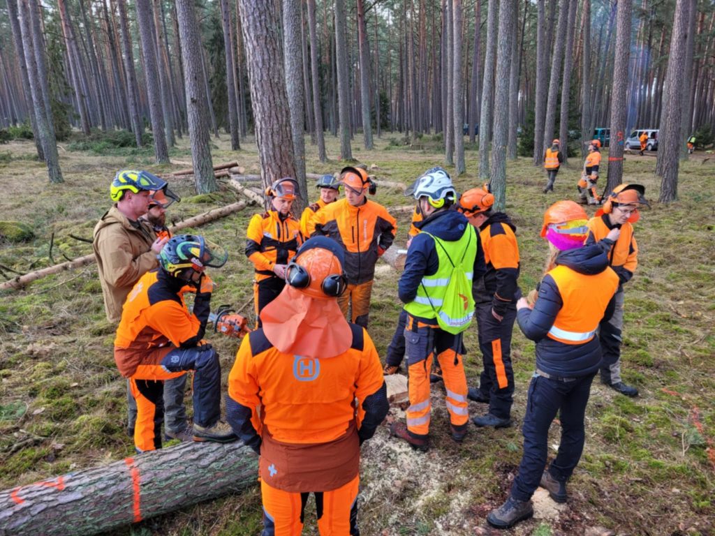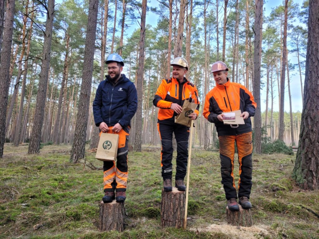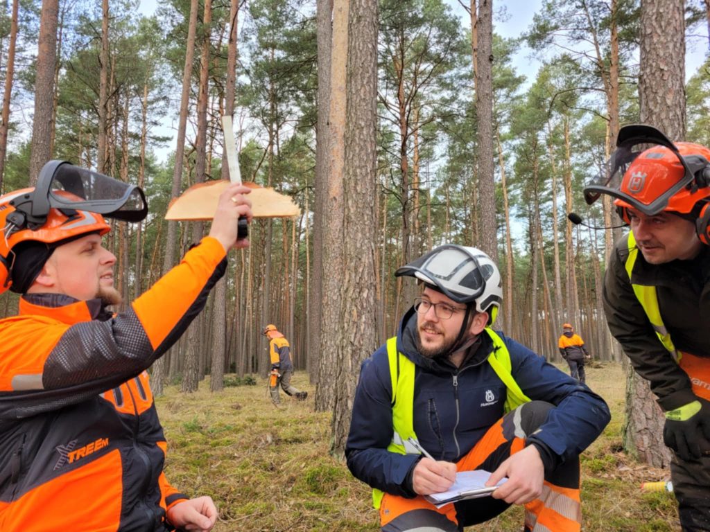 Podczas pierwszego dnia szkolenia miały miejsce zajęcia praktyczne, które od godzin porannych realizowane były na działce zrębowej w gościnnym leśnictwie Wymysłowo. Tam uczestnicy mogli zmierzyć się w konkursie ścinki drzew, która przebiegała według obowiązujących na zawodach zasad. Była to doskonała okazja do przećwiczenia nie tylko samej ścinki, ale i jej przygotowania oraz oceny. W konkursie najlepszy okazał się pan Lesław Dobosz ze szkoły leśnej w Lesku, przed panami Wojciechem Walkowiakiem z Rogozińca i Szymonem Bajem z Warcina – gratulujemy iście profesorskich umiejętności oraz wysokich wyników!