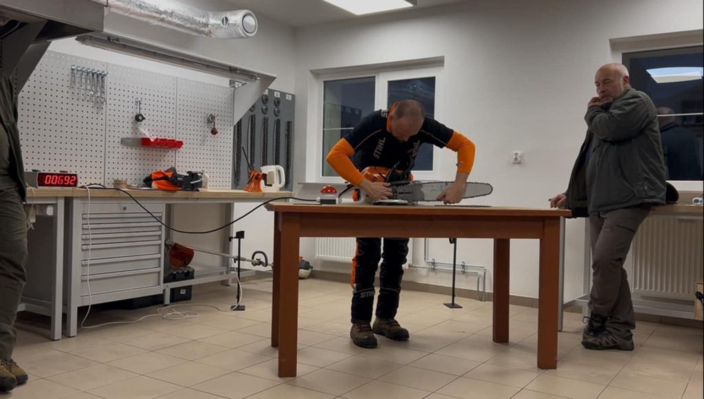 Drugą część zajęć praktycznych realizowano w warunkach warsztatowych oraz pod wiatą treningową. Prowadzący szkolenie Kamil Szarmach przybliżył zasady przygotowania, przeprowadzania oraz oceniania pozostałych konkurencji technicznych, czyli wymiany piły łańcuchowej, przerzynki kombinowanej, przerzynki na dokładność i okrzesywania.