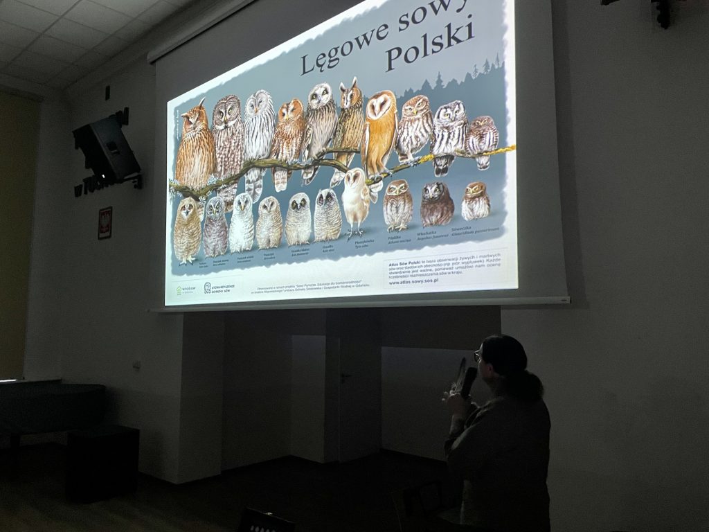 Podczas spotkania prelegentka przekazała najważniejsze informacje dotyczące biologii, występowania oraz zwyczajów sów, zwracając uwagę na ich przystosowania do nocnego trybu życia, sposoby polowania oraz rolę, jaką odgrywają w ekosystemach leśnych. Wiedzę naukową uzupełniła barwnymi opowieściami o własnych przygodach i doświadczeniach terenowych, zdobytych podczas wieloletnich obserwacji prowadzonych na terenie Zaborskiego Parku Krajobrazowego. Uczniowie mieli również okazję poznać działania podejmowane przez ornitologów na rzecz ochrony sów, w tym monitoring populacji, zakładanie budek lęgowych oraz prowadzenie badań terenowych. Wykładowi towarzyszyły zdjęcia i krótkie filmy – także te z własnych obserwacji i badań prowadzącej, a także niezwykłe eksponaty, takie jak wyplówki, pióra czy jaja, co pozwoliło uczniom lepiej poznać te niezwykłe ptaki.